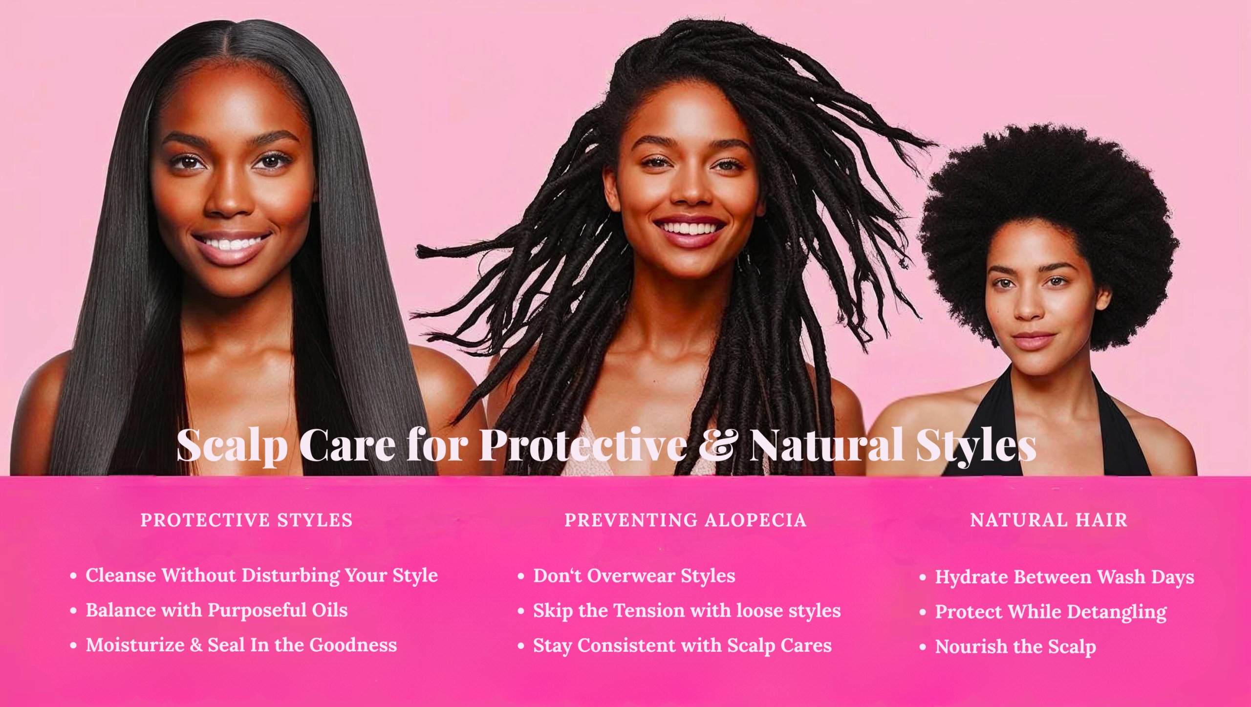 Whether you wear braids, twists, dreadlocks, weaves, or rock your natural texture, your scalp deserves intentional care. Healthy, beautiful hair begins with a balanced, nourished scalp—especially when your style limits daily access to it.